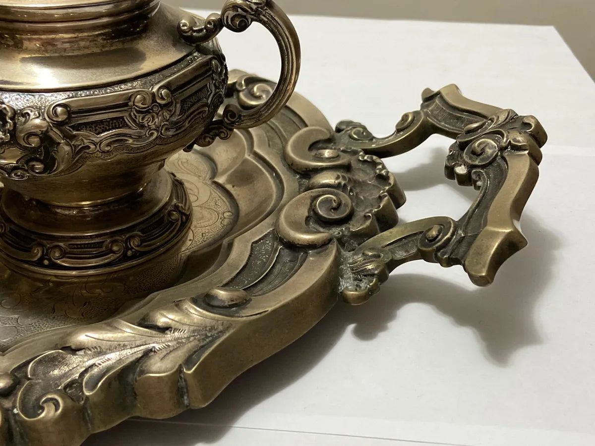 Peças ricamente cinzeladas, com concheados e volutas de grande refinamento artístico, evidenciando o trabalho manual de ourives portugueses da época.